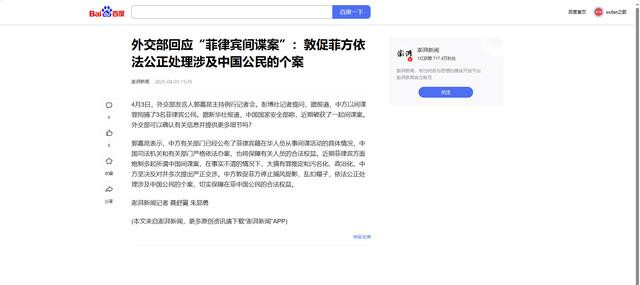 参考信源:澎湃新闻2025-04-03外交部回应“菲律宾间谍案”:敦促菲方依法公正处理涉及中国公民的个案